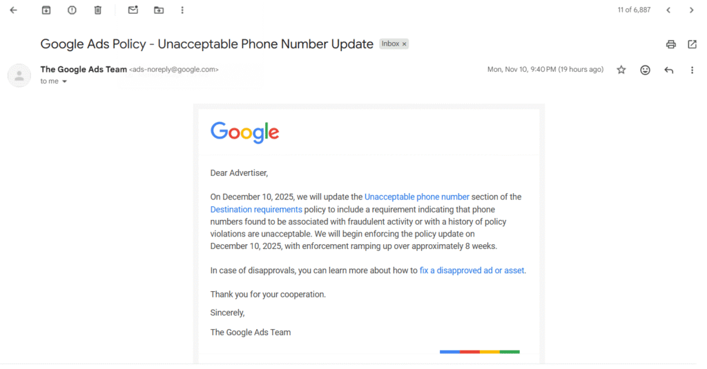 گوگل اخیراً اعلام کرده که از تاریخ 10 دسامبر شماره تلفنهایی که در تبلیغات تماس، افزونه تماس (Call Extension) و افزونه Location استفاده میشوند باید واقعی، فعال و مرتبط با همان کسبوکار بوده و در کشوری که تبلیغ هدفگیری شده قابل استفاده باشند. شمارههای غیرفعال، نادرست، نامرتبط، شماره فکس، شمارههای با هزینه اضافه و همچنین شمارههای مجازی برخلاف این سیاست هستند و ممکن است باعث رد شدن تبلیغ شوند، گوگل برای تأیید صحت شماره تماس ممکن است یک تماس آزمایشی کوتاه برقرار کند.