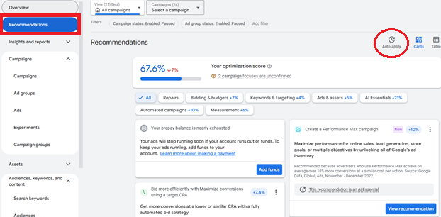 1.به قسمتAll Campaigns بروید، Recommendations را انتخاب کنید و بعد گزینه Auto-apply را انتخاب کنید.