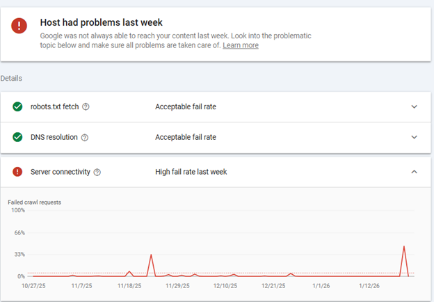 همچنین به دلیل عدم دسترسی کراولرهای گوگل به وب سایت، گزارشات سرچ کنسول افت شدید ترافیک و قطعی و عدم ارتباط با سرور را نمایش میدهند. این ناپایداری در گزارشات مربوط به تجربه کاربری، ثبت شده و گزارش خطاهای مربوط به عدم دسترسی، به گوگل ارسال خواهد شد. در نتیجه، این موارد، باعث افت کیفیت کلی سایت و صفحات آن شده و امتیاز منفی در تجربه کاربری در نظر گرفته میشود.